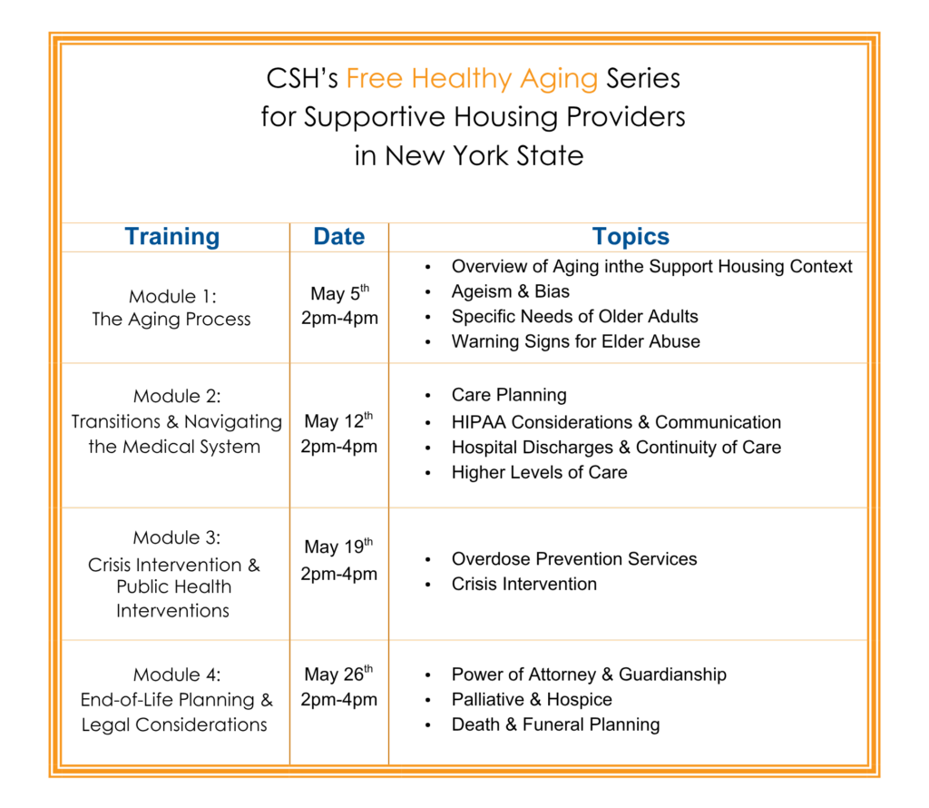 - Module 1 (Tuesday, May 5, 2026 | 2:00 PM – 4:00 PM) will lay the foundations of aging and ageism within the context of supportive housing service provision. Participants will gain an understanding of the holistic health needs of older adults, tools to identify elder abuse, and methods for increasing accessibility.